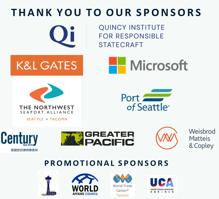 A heartfelt thank you to all our speakers for sharing their insights, expertise, and candor, and to our sponsors, members, and partners for their incredible support in making this event possible. Special thanks to our generous sponsors: the Quincy Institute, K&L Gates, Microsoft, the Northwest Seaport Alliance, Port of Seattle, Weisbrod Matteis and Copley, Century Law, and Greater Pacific Industries.